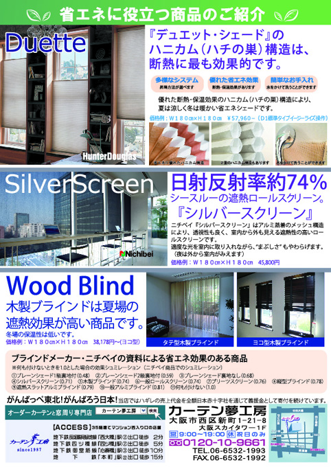 「すだれの利用で太陽熱を遮断」ということは書かれているのですが、カーテンやブラインド、ロールスクリーンのインテリア商品」を利用して省エネ・節電をしましょうということは一言も触れられていません。