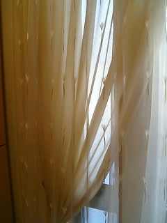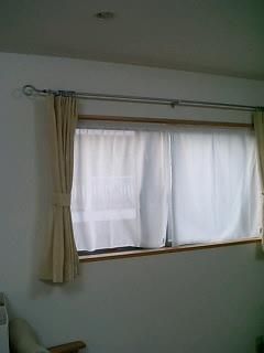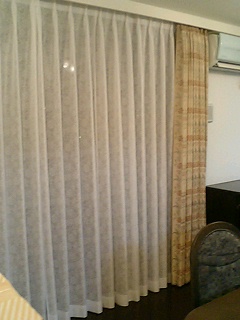 は、下の写真のような2倍強の生地を使ってパイプ通しをしてキャザーをとることを提案したのですが、お客様は側面の窓のプレーンシェードと同じイメージでしたいとのことで、レースをプレーンな感じで