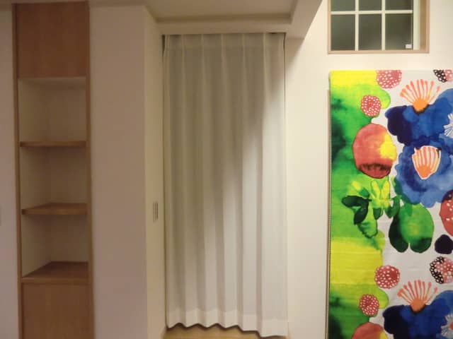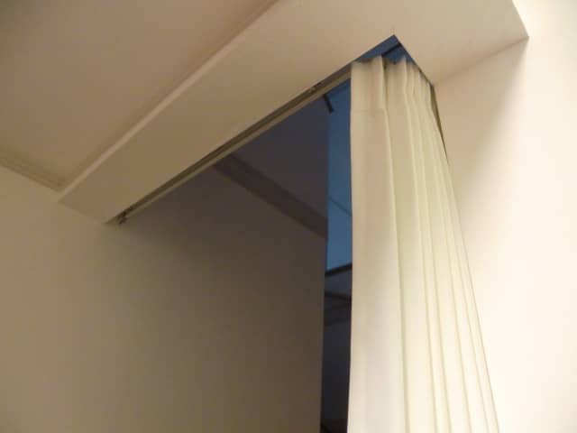 こちらの2階に上がったところにカーブレールを天井に直付けして間仕切りカーテンを