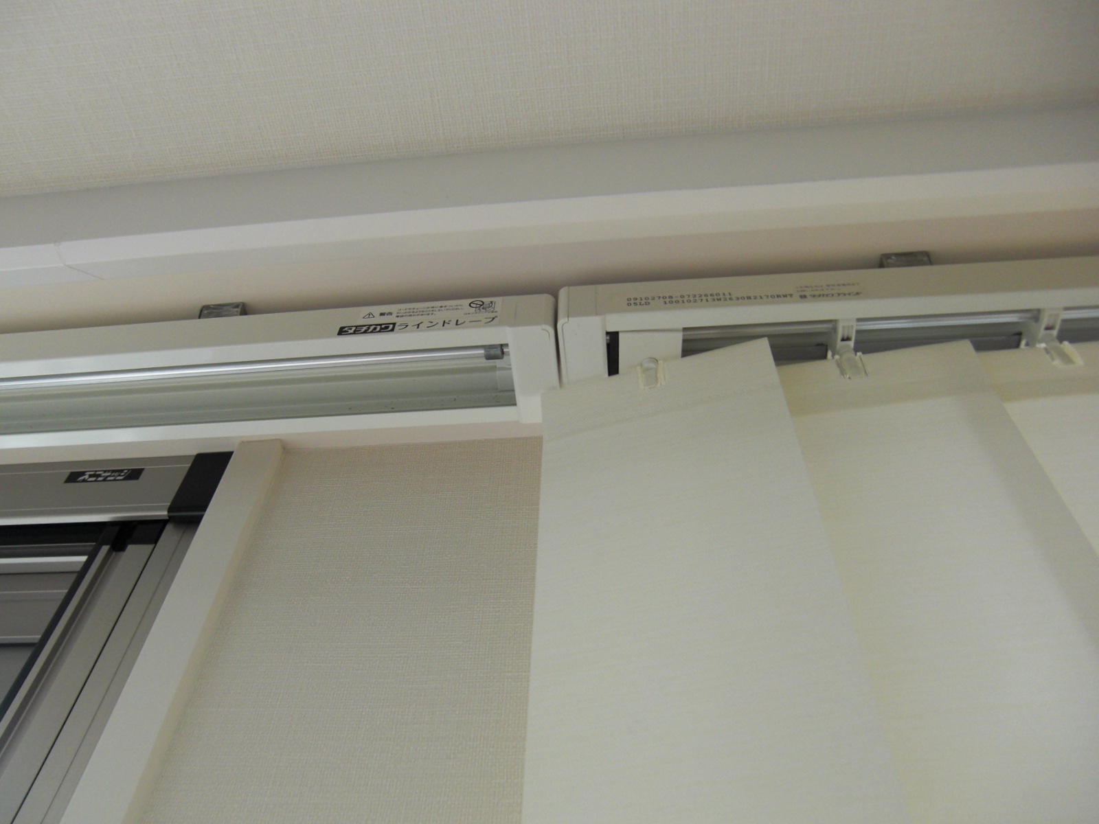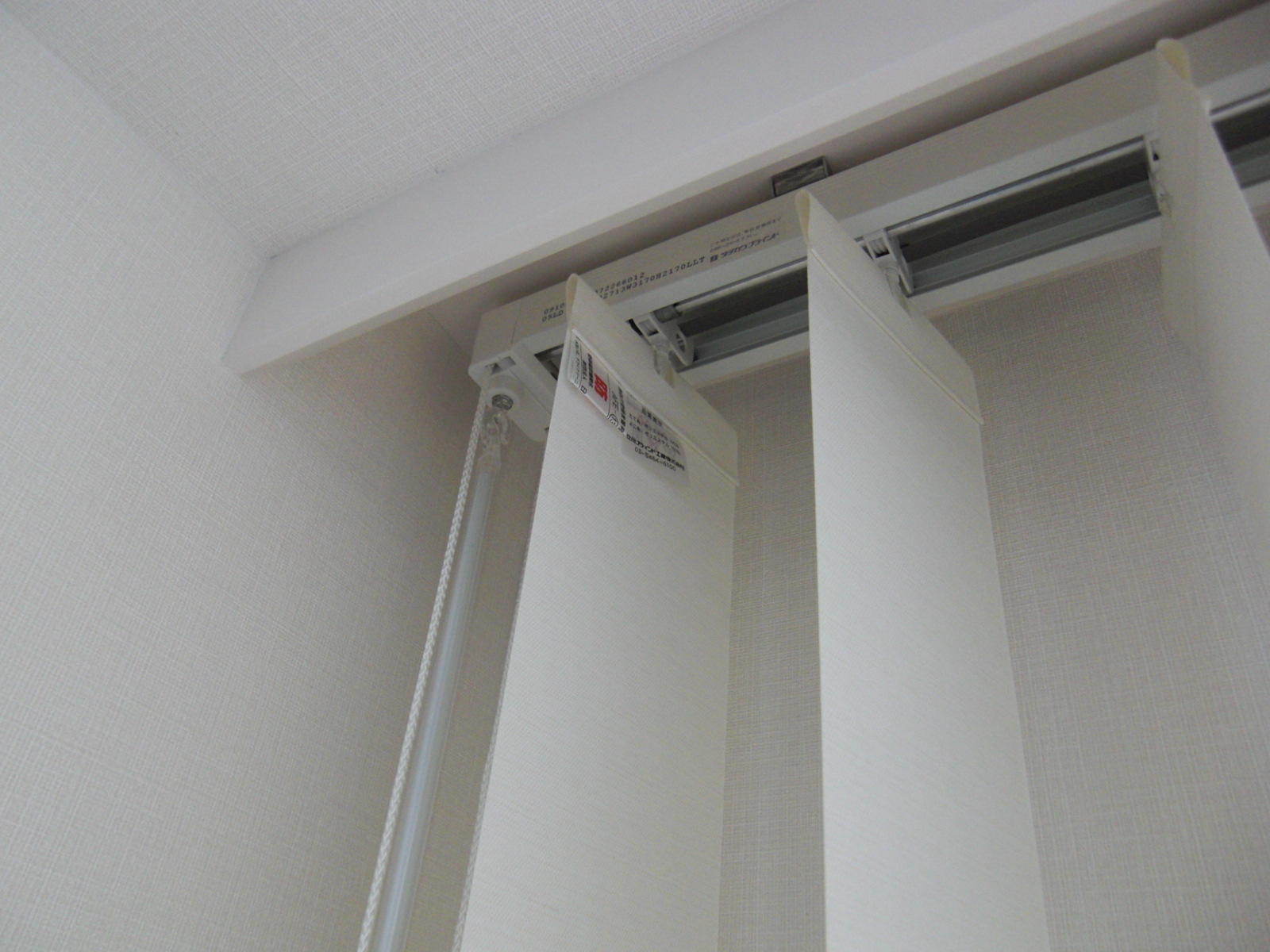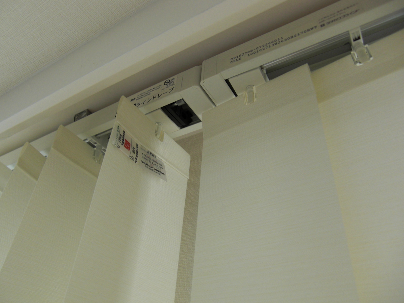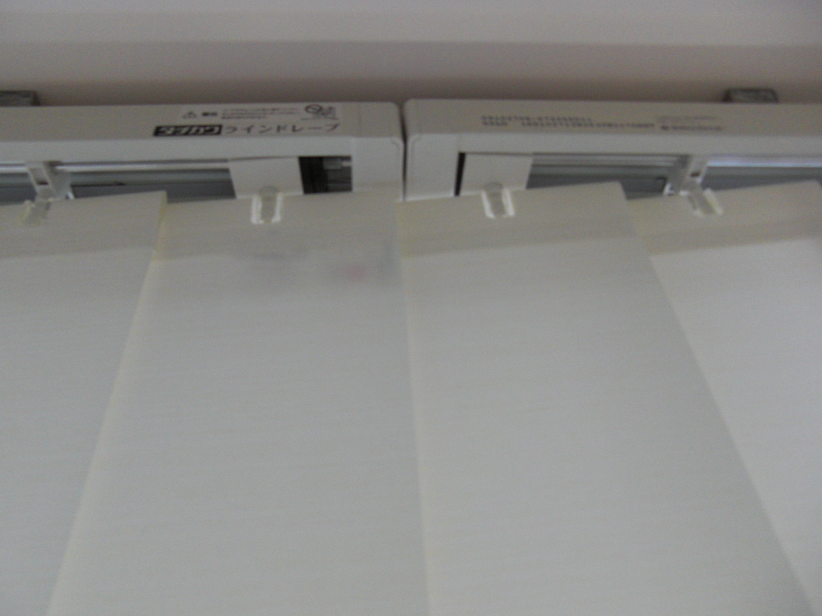 しかし、本来操作側の一番めだたないところに防炎ラベルのついているルーバーをとりつけなければならないのですが、2台とも右側に防炎ラベルをつけてルーバーを裾のボトムチェーンでつなげているのです。