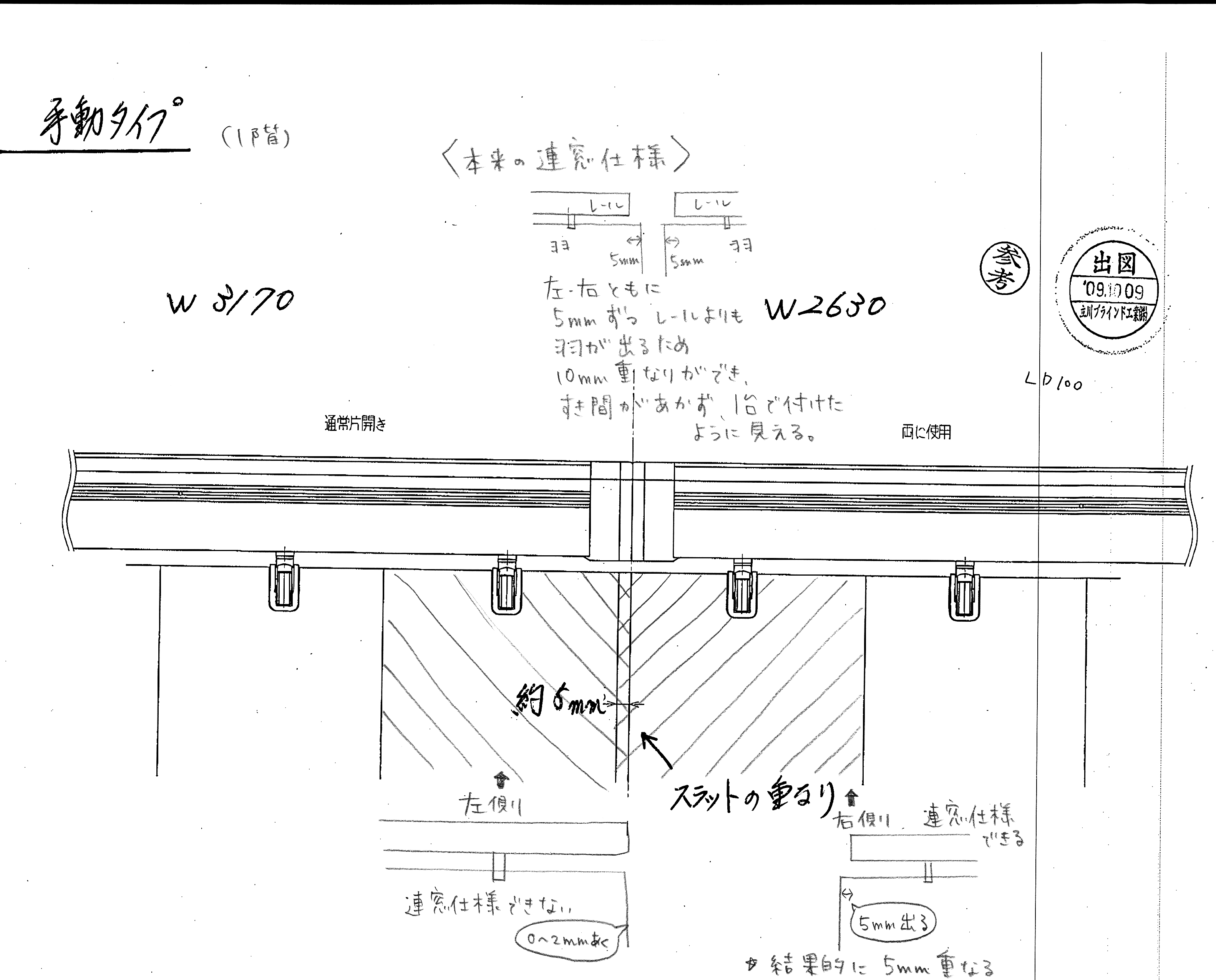 CIMG3064このように2台にわけてつなぐときは、各メーカーとも連窓仕様というのがありまして、つなぎ合わせる方が両方とも羽根(ルーバー)が5ミリでて隙間があかないようにすることができます。