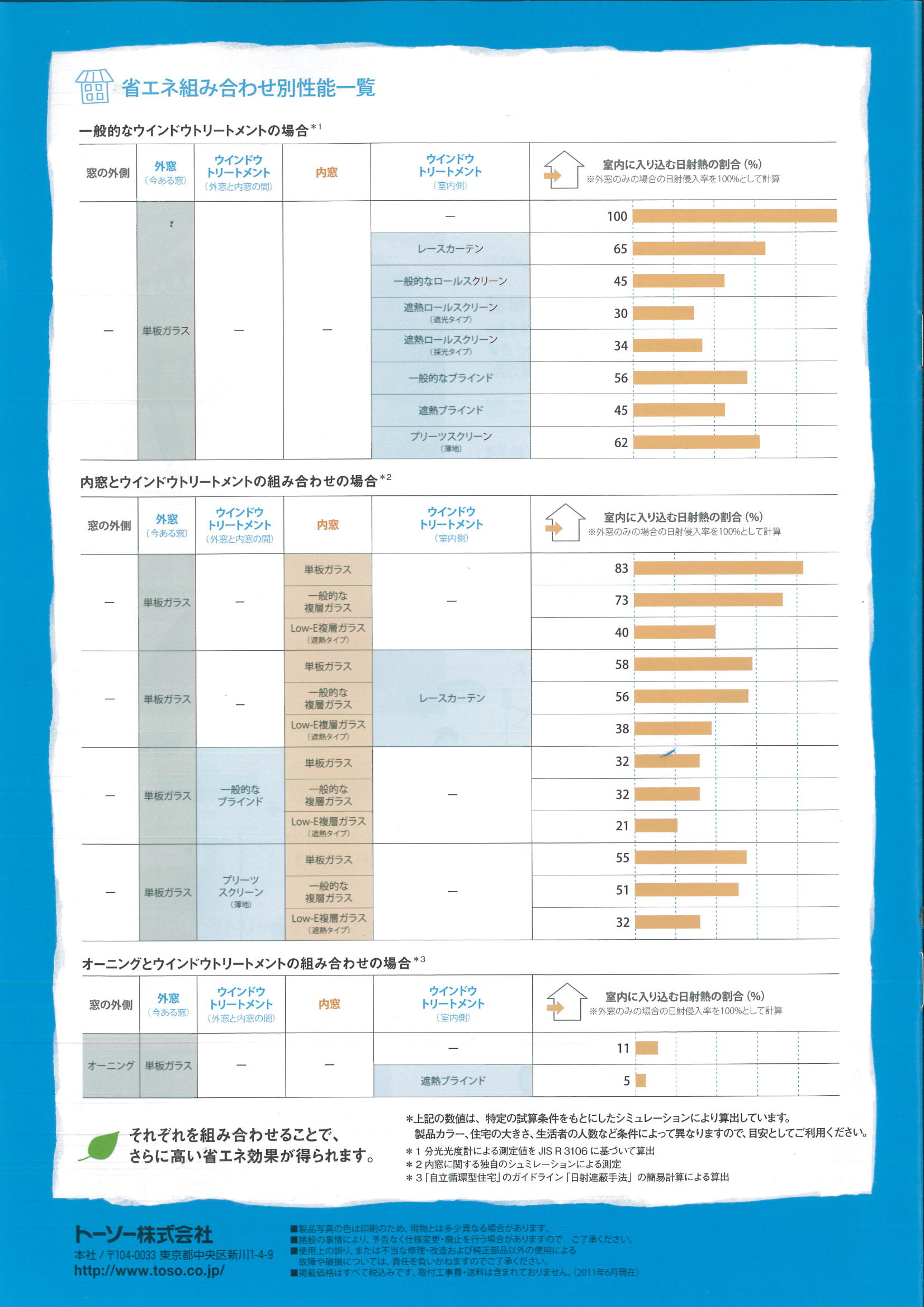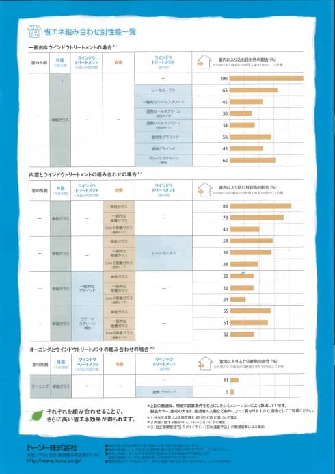 ここには、一般的な窓で、室内に入り込む日射熱の割合を表示していて、レースカーテンとロールスクリーンやブラインドとの対比データが載っているのです。