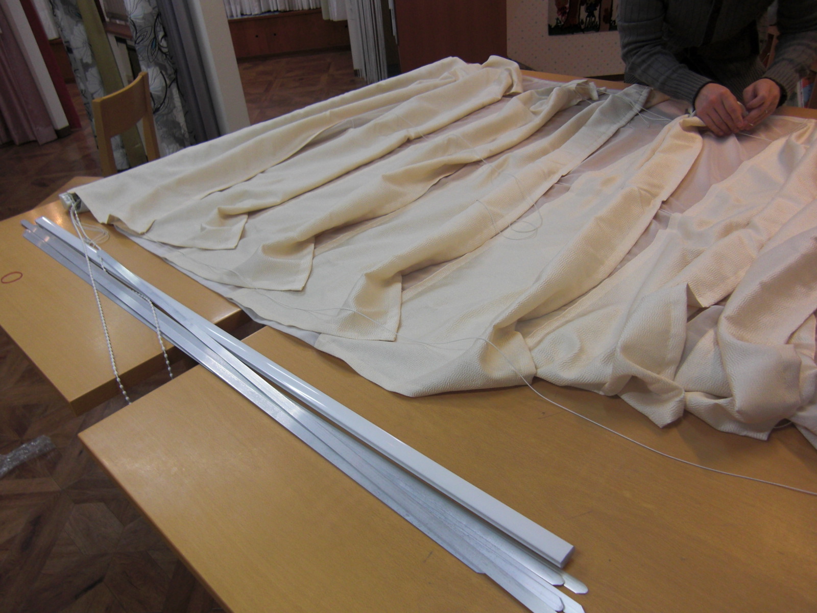 断ろうかと思いましたが、空気を読んで「そうさせてください。ありがとうございます」といってレースを取り付けて仮吊りカーテンはそのままでドレープだけクリーニングの為に持ち帰りました。