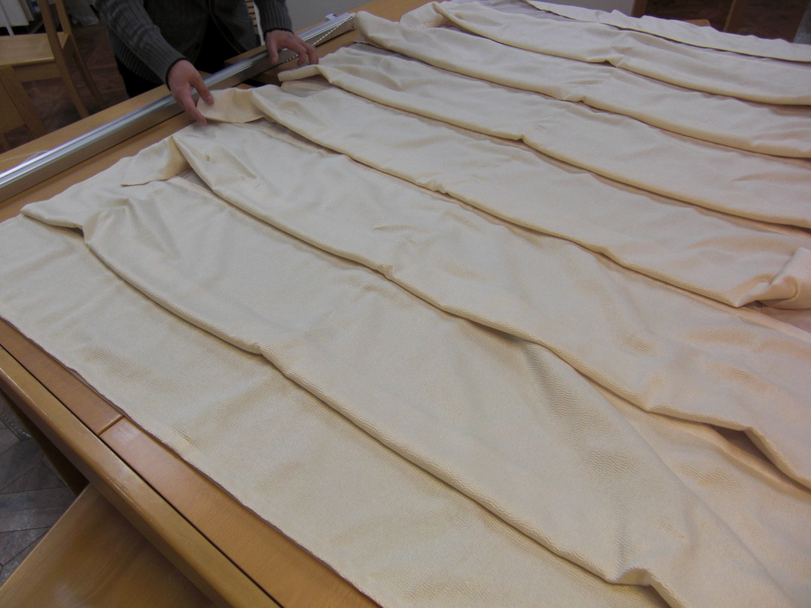 巾560センチ高さ240センチのカーテンで5年洗っていないもので、お客様の本音としてはクリーニングをしたいようなのですが、お客様は上げた拳が下ろせないので、「とりあえず2度手間になるけど、レースだけ吊っておいて先にドレープを洗って、それができたらレースを洗うというのが最低限の妥協できるところだな」とおっしゃるのです。