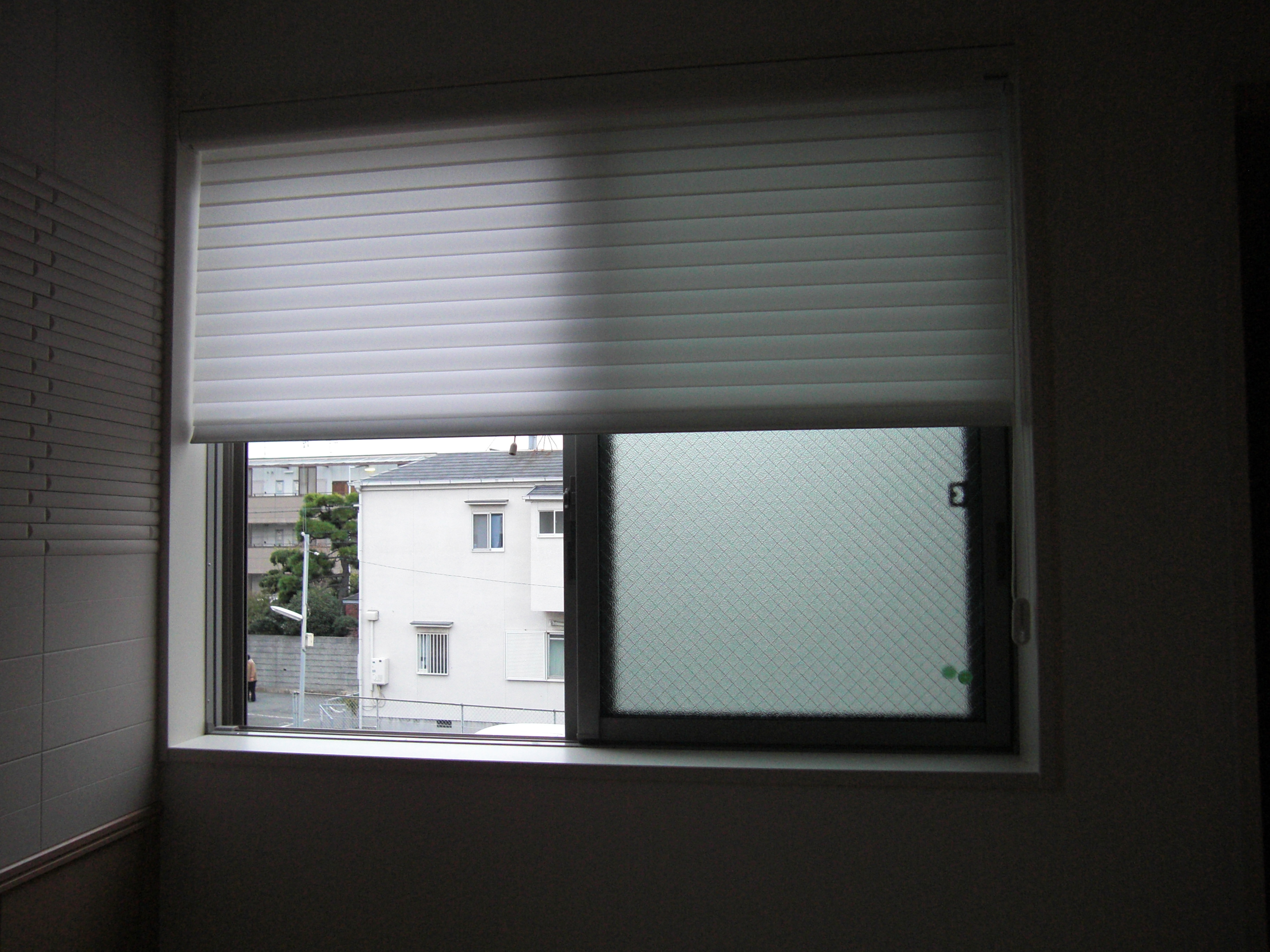 腰窓や掃き出しの窓があり、丈が違うものを同じ部屋に取り付けた時に、少し上げた時の見え方が違います。上にあがると隠れます。