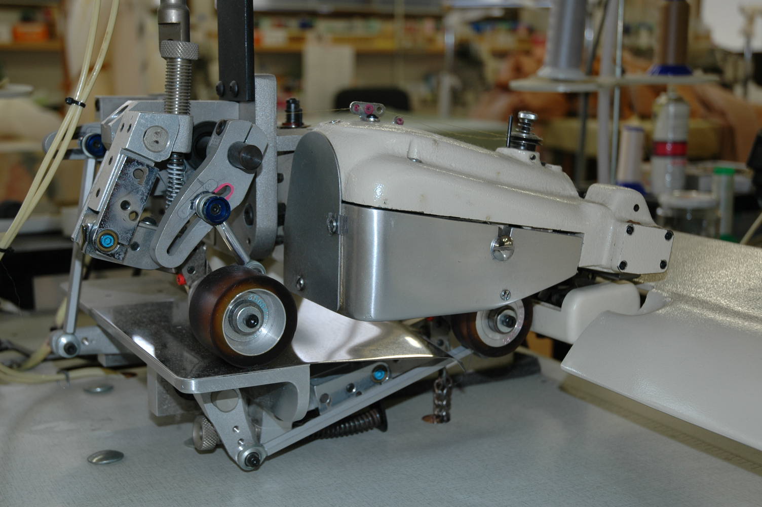 綿・レーヨンも水洗いしますので、多少縮みますが、洗濯する前に必ずサイズをはかり、縮んだ場合は写真のような機械で蒸気をあて、下にウエイトをつけて縮みを最小限にするようにしています。どうしても元のサイズにならない場合はお客様の了解を得て丈のばしをしております。