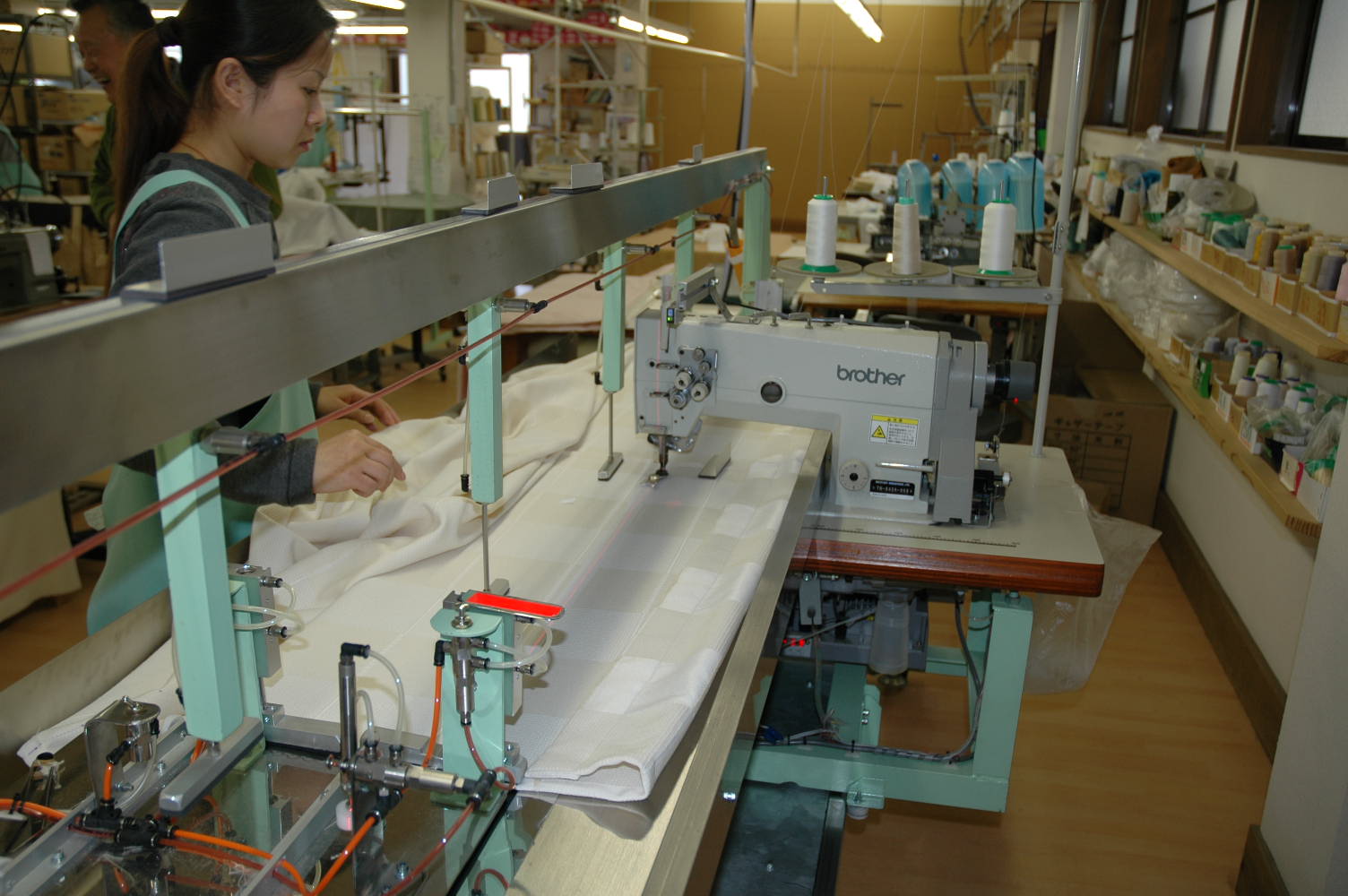 当店のカーテンクリーーニングシステムは、大分の縫製加工所に設備があります。クリーニング屋はクリーニング師という国家資格が必要で、もちろん有した者が担当しておりますが、街のクリーニング屋と違うのはカーテン生地のわかった者がしているということです。また、加工所でしているため、ほつれの修理や丈直しもすぐにできますし、納品は形状記憶をかけてプリーツたたみをしております。